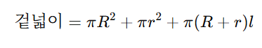 원뿔대의 높이(h), 아랫면 반지름(R), 윗면 반지름(r),