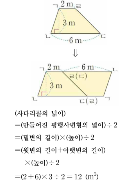 → 두 밑변의 평균 길이에 높이를 곱한다고 기억하면 더 쉽습니다.