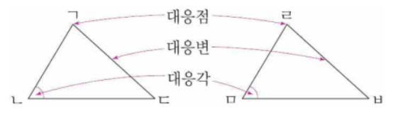 - 합동: “두 도형을 평행이동·회전·대칭이동하여 포개면 겹친다. 따라서 대응변의 길이와 대응각의 크기가 같다.”