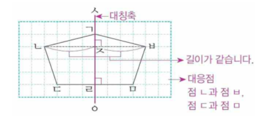 - 선대칭: “대칭선은 대응점들을 잇는 선분의 수직이등분선이다. 두 점은 대칭선에서의 거리가 같다.”