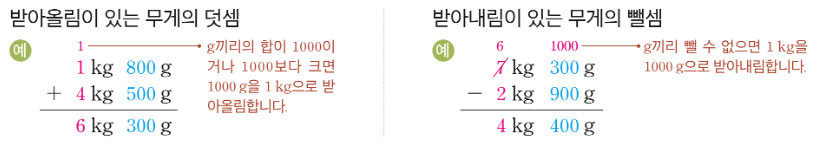 무게의 덧셈과 뺄셈도 들이의 계산과 비슷하게 단위를 맞춰야 합니다.
