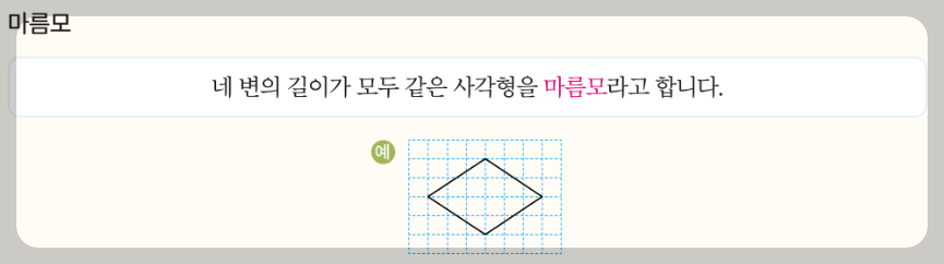 사각형 단원에는 직사각형, 정사각형, 마름모, 평행사변형, 사다리꼴이 등장합니다.