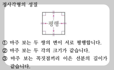 - 직사각형·정사각형·마름모·평행사변형은 평행한 변이 두 쌍 있는 사각형,