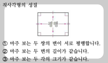 즉, 직사각형은 “반듯한 모양의 네모”로, 변의 길이는 짝을 이루어 같고 각이 모두 네모꼴입니다.